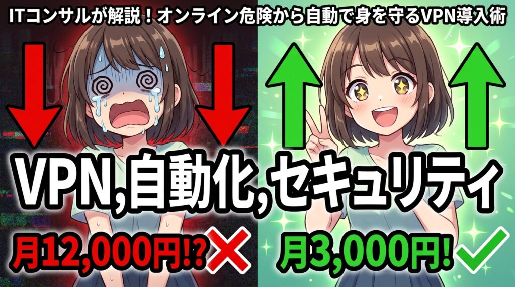 ITコンサル中村が面倒くさがりゆえに辿り着いた、VPNによるオンラインセキュリティ自動化術を徹底解説。情報漏洩の不安から解放されるための厳選VPNサービス3選と導入ステップを紹介します。